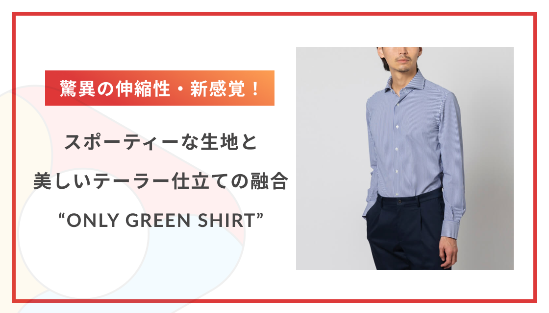 【商品名】 ONLY GREEN SHIRT 【商品の特徴】 「スポーティーな生地と美しいテーラー仕立ての融合」 ナイロン素材生地にデジタルプリントを施した、新感覚シャツ。 【驚異の伸縮性】を誇るシャツが完成しました。 見た目は通常のシャツと変わらず、ネクタイもビシッと決まります。サラっとした肌触りと、ヒヤッと接触冷感機能を持ち合わせた素材で、夏に最適です。 特徴は生地だけではなく、縫製技術の高さにもあります。とてもスリップやすく縫いにくい生地をドレスシャツに仕立てました。縫製が非常に難しく、ここまできれいに仕立てるところは他にはありません。シワにもなりにくく、吸水速乾性が高く、快適な着心地で、ビジネスに大切な品格とアクティブさを両立させた、これまでにないドレスシャツです。 【商品のURL】 https://onlinestore.only.co.jp/products/detail.php?product_id=4017 ■ブランド紹介 ONLY GREENは「仕事帰りにゴルフの打ちっぱなしに行ける」がコンセプトです。流行りのゴルフウェアでなく、あくまでビジネスシーンに役立つ商品となっております。シャツ・パンツスタイルに、シューズやバッグまでトータルに展開しております。